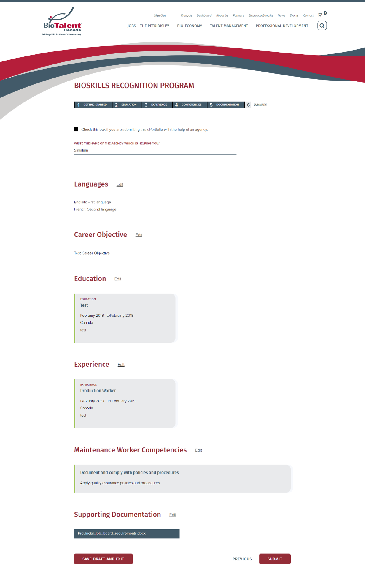 BioSkills Recognition Program, step 6 of 6. Applicants review their submission to ensure completeness.