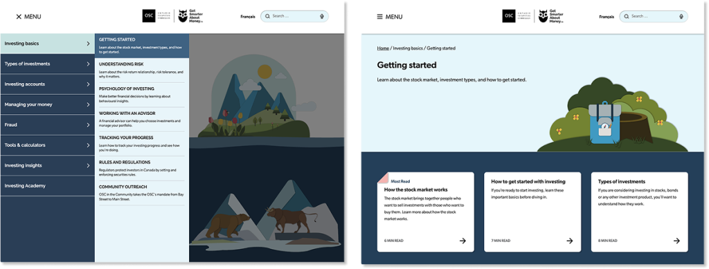 The primary goal of the GetSmarterAboutMoney.ca project was to advance the Ontario Securities Commission’s (OSC) mandate of strengthening investor protection. By focusing on human-centered navigation, we sought to create an accessible and intuitive experience for users of all experience levels, particularly newcomers, new investors, and older Canadians. The project also aimed to refine the platform’s content to better support users in building their financial knowledge and making informed decisions, all while ensuring that the design was modernized to improve usability and scalability.