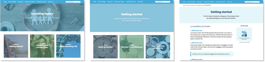 Using the insights gained, we developed a taxonomic model that segmented audiences according to their financial understanding and identified key subgroups. This model served as the foundation for forming hypotheses on information architecture (IA), which led to the design of learning paths and top task journeys. During this process, we conducted a readability assessment on the top 25 articles, presenting the results and documenting the methodology for the client’s content team, who then applied this protocol to the remaining content.
